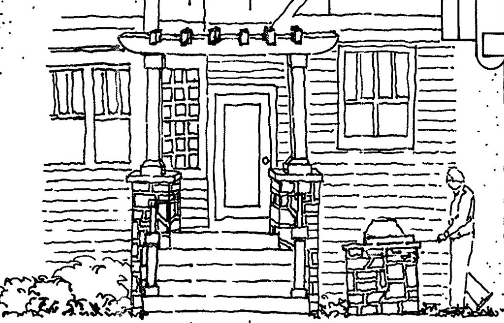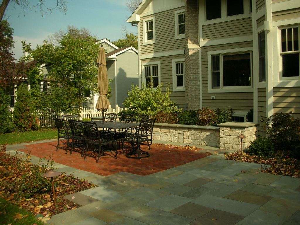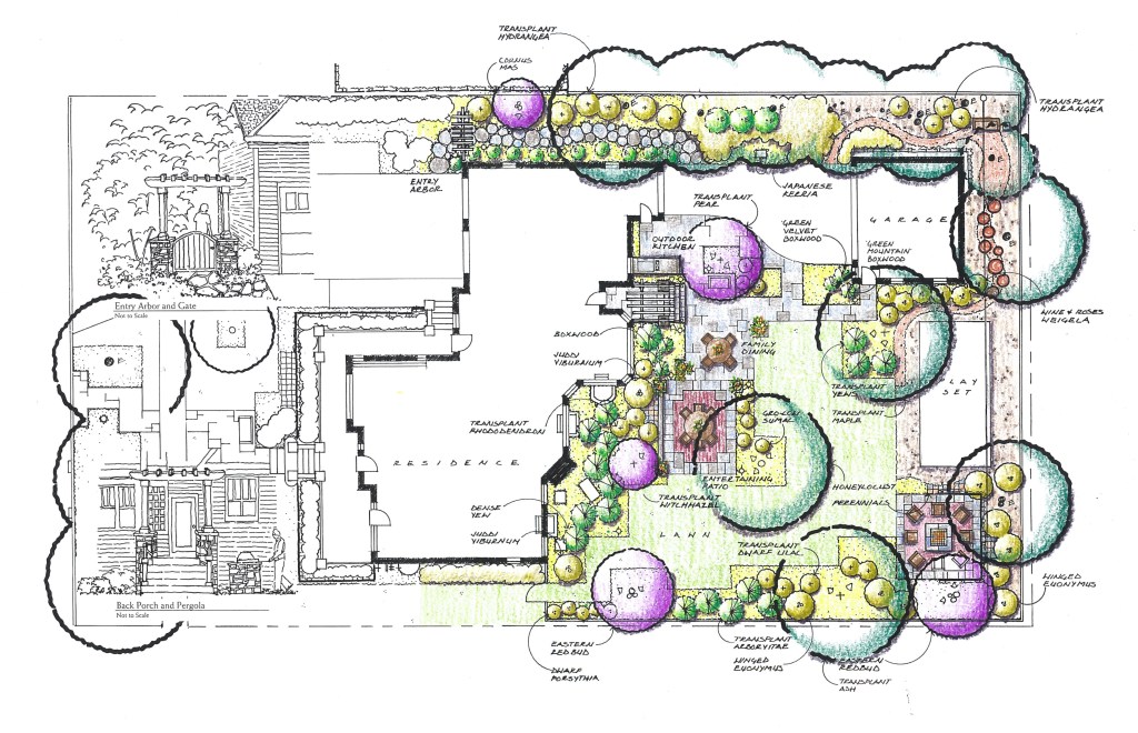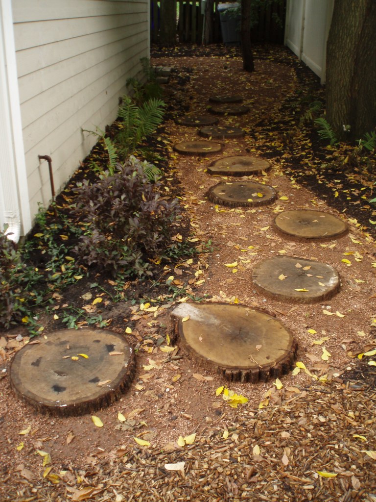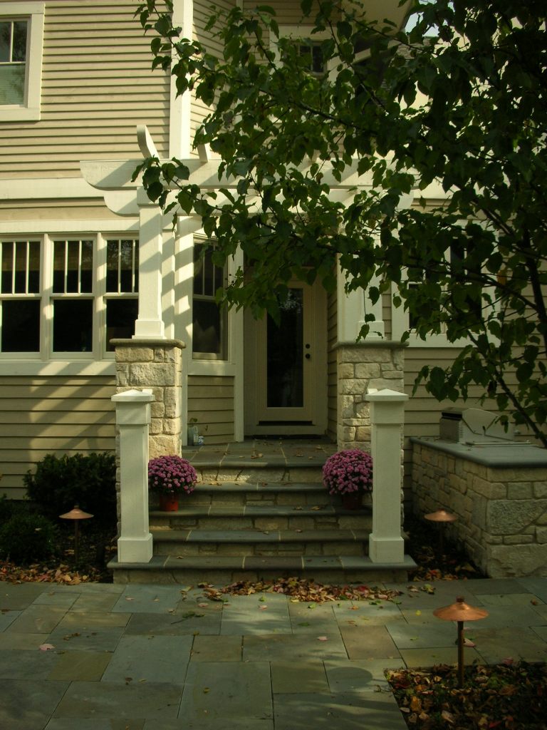 For the Family Entertaining design, a white, bright pergola and extended porch makes the entrance to the home more inviting. Smooth transition of spaces, with accents of warm red brick in the paving, make this the perfect backyard for entertaining guests. The gate along the garage was designed with the same style as the pergola in the backyard. These design features, along with a soft plant palette used in the front and backyards, provide continuity throughout the entire landscape. A fun stepping path for kids was created using a cross section of a stump. A firepit was constructed for entertaining guests and Friday night s’mores with the family.
