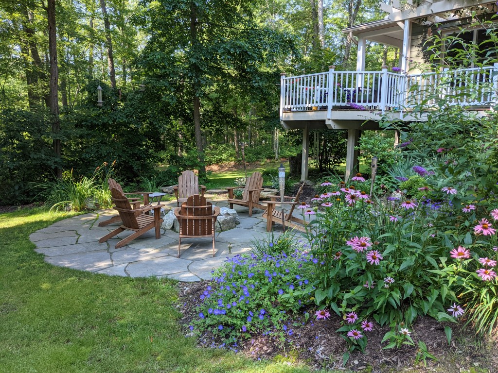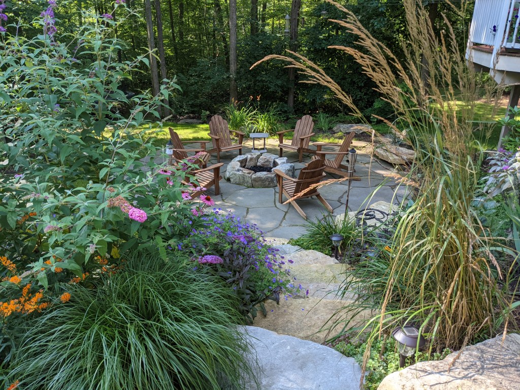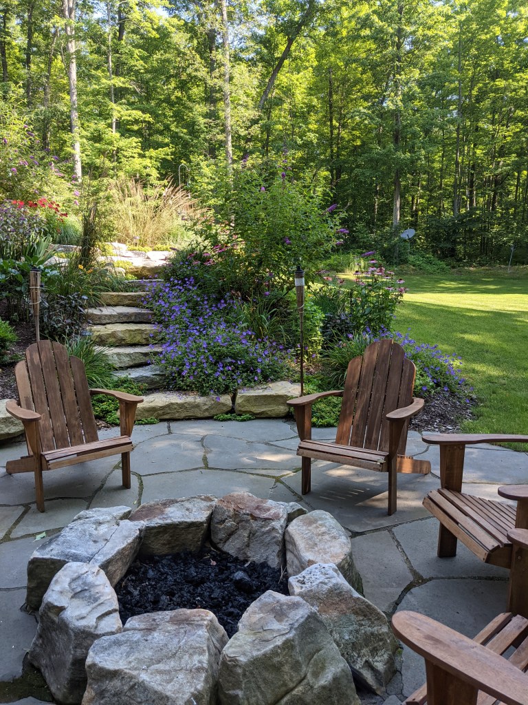 This project provides the perfect place to spend quality family time. A stone stair with a large landing in the middle allows the children and dogs to easily walk out to the open lawn where they can run and play sports before it turns down to a firepit and patio below. Here the family can spend summer evenings enjoying each other’s company and relaxing by the fire.